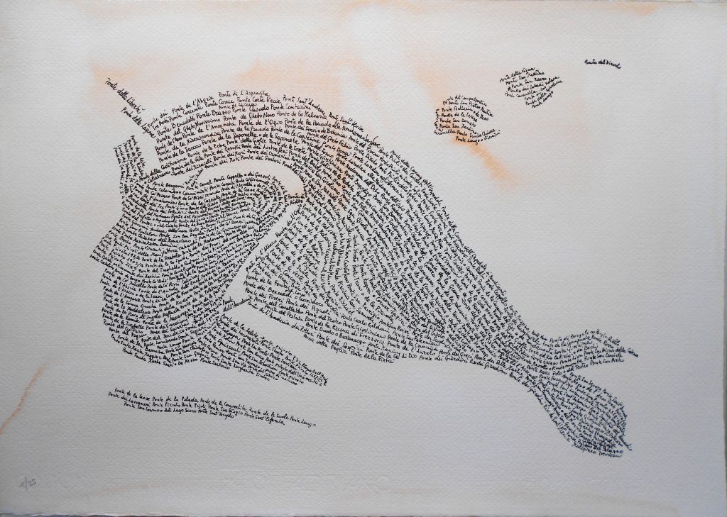 Scrive Marco Bussagli nel catalogo: «la poetica di Elena Dell’Andrea verte sull’ambiente antropico e sulla sua Venezia che fra tutte le città è quella che meglio di ogni altra rappresenta l’idea di ponte fra culture diverse. […] la sua stessa urbanistica, come sa bene la giovane Elena è attraversata da ponti che fanno della frammentazione un’unità. Nascono allora gli acquerelli dedicati al tema, oppure la serigrafia in blu, intitolata, appunto Venezia e i suoi ponti che si è meritata la segnalazione all’edizione 2017, del Premio Celeste. Pare una pianta di precisione vista dall’alto l’intera immagine, ma se si vede bene, a costituire quell’orografia grafica sono parole. Di nuovo il linguaggio, visivo e verbale che si fa opera d’arte […]. I ponti di Elena Dell’Andrea vengono da lontano e vanno lontano a congiungere epoche diverse che prendono le mosse da Die Brücke e, scavallando il secolo dei grafismi di Klee, ricama sulla pelle della carta i ghirigori dei propri sogni […]. Con il suo tratto leggero, che è solo uno dei suoi mezzi espressivi (dalla performance alla land art), Elena racconta il suo mondo e la sua arte spalancando sugli occhi degli altri i propri mondi interiori».