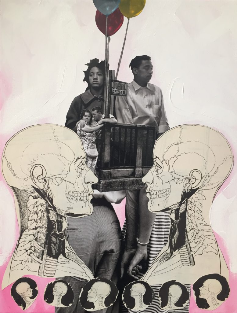 Daniela Di Lullo lavora con pittura e collage creando realtà inedite, specchi perplessi del nostro quotidiano contemporaneo.