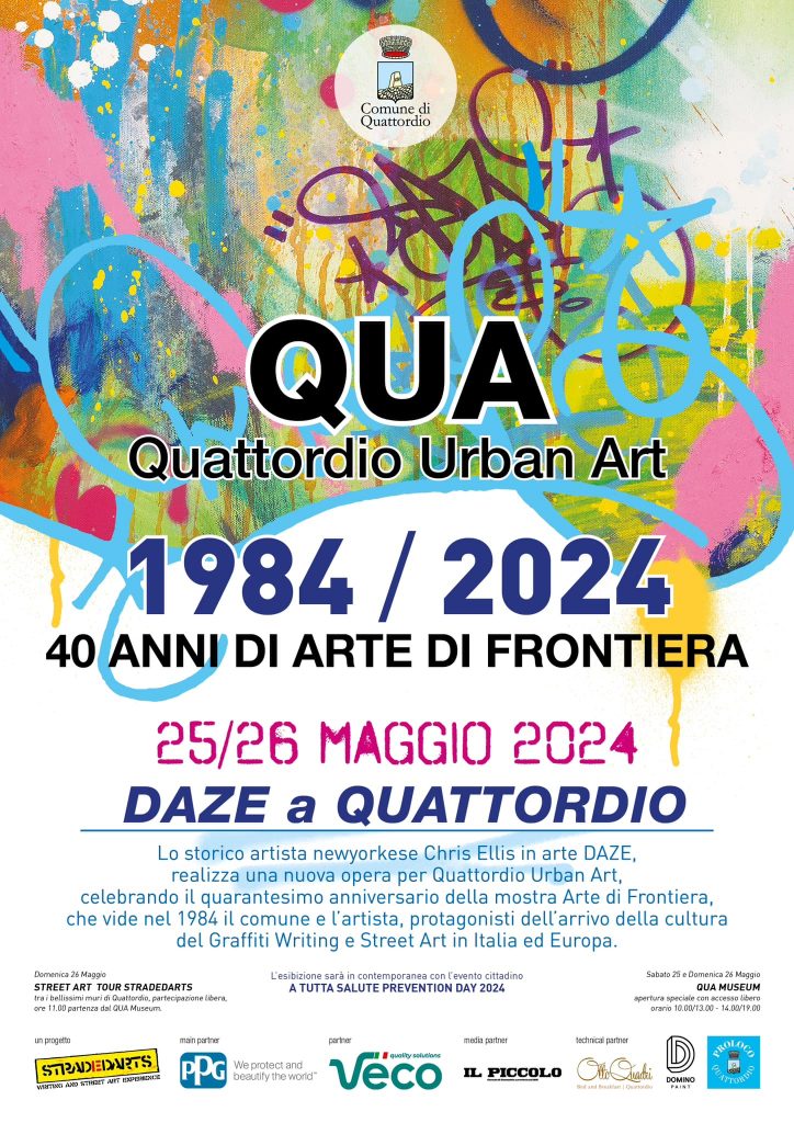 celebra il quarantesimo anniversario della mostra Arte di Frontiera, che lo vide nel 1984 protagonista dell’arrivo della cultura del Graffiti Writing e Street Art in Italia ed Europa. Un evento speciale dedicato all’arte e il colore, che prosegue le attività di QUA - Quattordio Urban Art. Lo storico artista newyorkese Chris Ellis in arte DAZE,