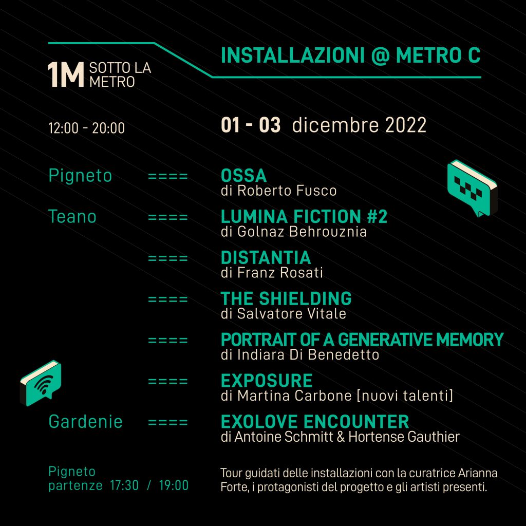 Sette opere interattive e di new media art, esposte in tre stazioni della Metro C di Roma - Pigneto,Teano, Gardenie - per l’ultima “fermata” di un progetto triennale che nelle precedenti edizioni ha registrato oltre 15.000 presenze di visitatori e coinvolto in tutto 20 artisti e 8 stazioni della terza metropolitana della capitale. Il progetto, promosso da Roma Capitale-Assessorato alla Cultura, è vincitore dell'Avviso Pubblico Contemporaneamente Roma 2020-2021-2022 curato dal Dipartimento