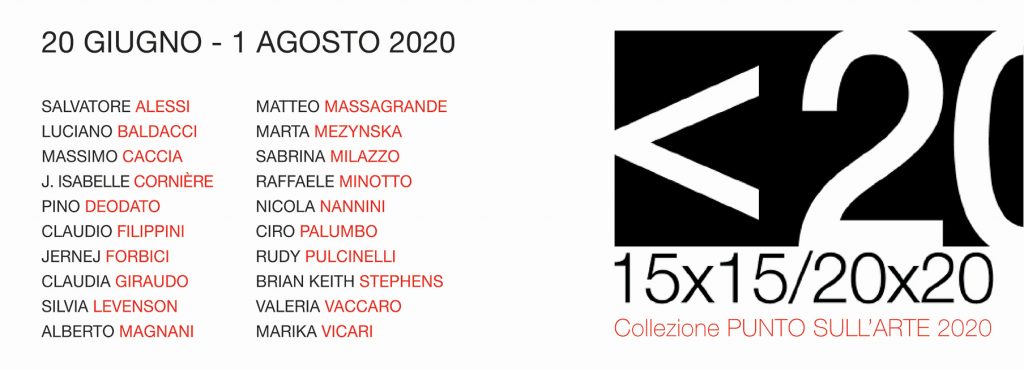 In occasione della VII Edizione della rassegna <20 15x15/20x20 | Collezione PUNTO SULL’ARTE, che si svolgerà a partire da SABATO 20 GIUGNO 2020, sono stati invitati appositamente per l’occasione 20 artisti, italiani e stranieri, con diverse esperienze nazionali e internazionali, con una forte presenza degli scultori che esporranno le loro opere accanto a quelle dei pittori.
