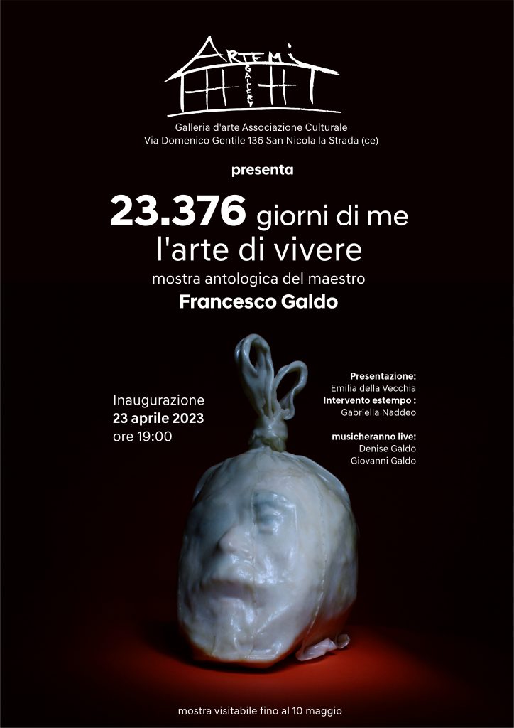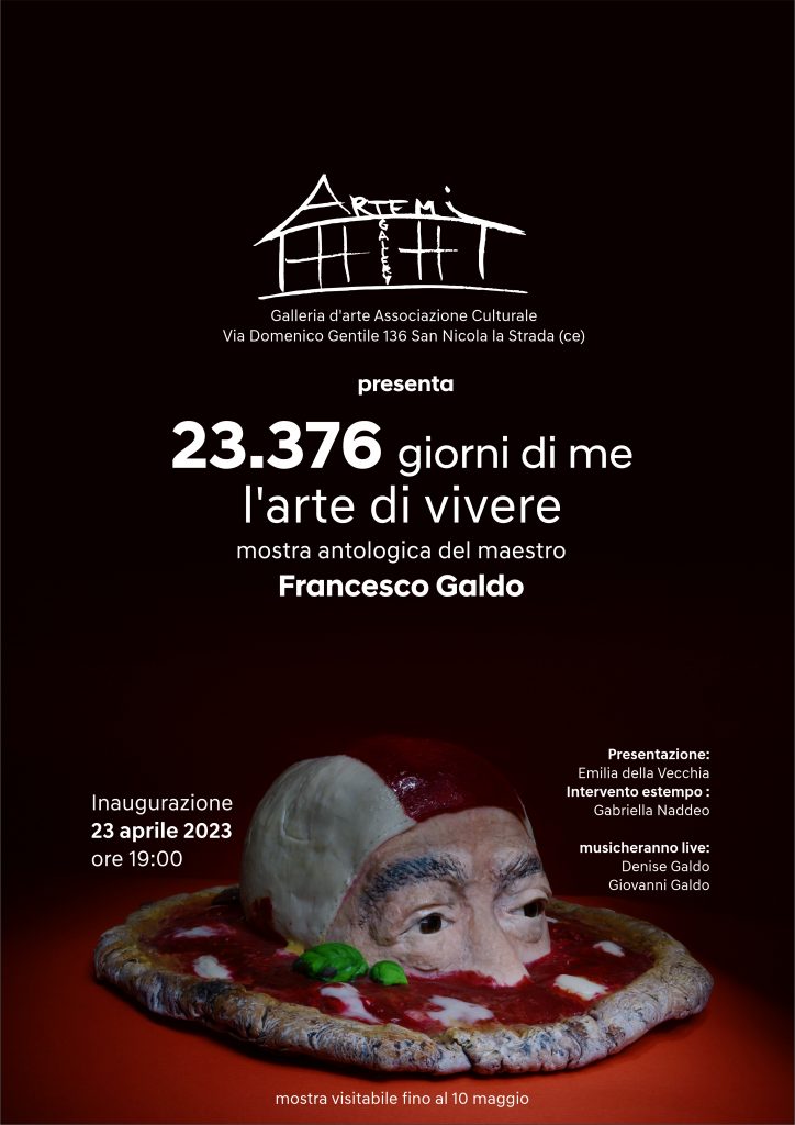 Mostra Antologica del maestro Francesco Galdo, 23 aprile - 10 maggio 2023 presso Galleria Artemi, San Nicola la strada Caserta. Vernissage 23 aprile ore 19:00. Presentazione Emilia Della Vecchia, con la partecipazione della scrittrice Gabriella Naddeo. Musica Live Denise Galdo e Giovanni Galdo.