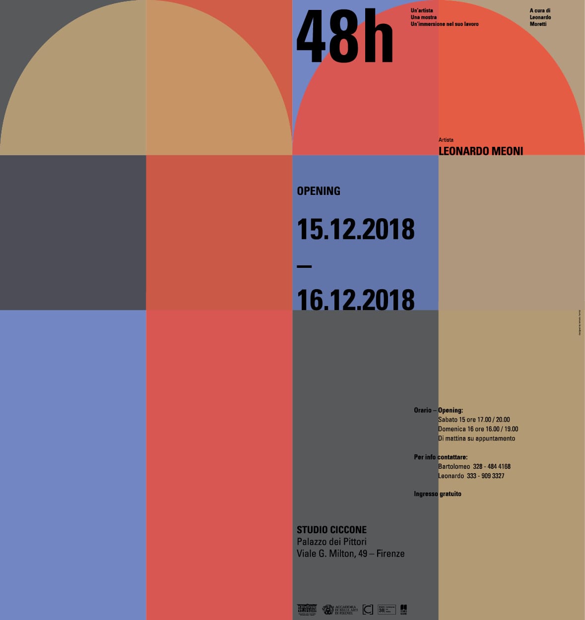Per il quarto e ultimo appuntamento della rassegna espositiva 48H, presso lo Studio Ciccone a Palazzo dei Pittori, è stato selezionato il lavoro dell’artista Leonardo Meoni. Indubbiamente eclettico e schietto, il lavoro di Meoni si presenta, attraverso l’uso di vari medium, come uno sguardo diretto, povero da costruzioni formali articolate, per mirare ad un gioco di immagini che abbandonano il loro significato principale per stratificarsi in precisi messaggi e tematiche care all’artista.