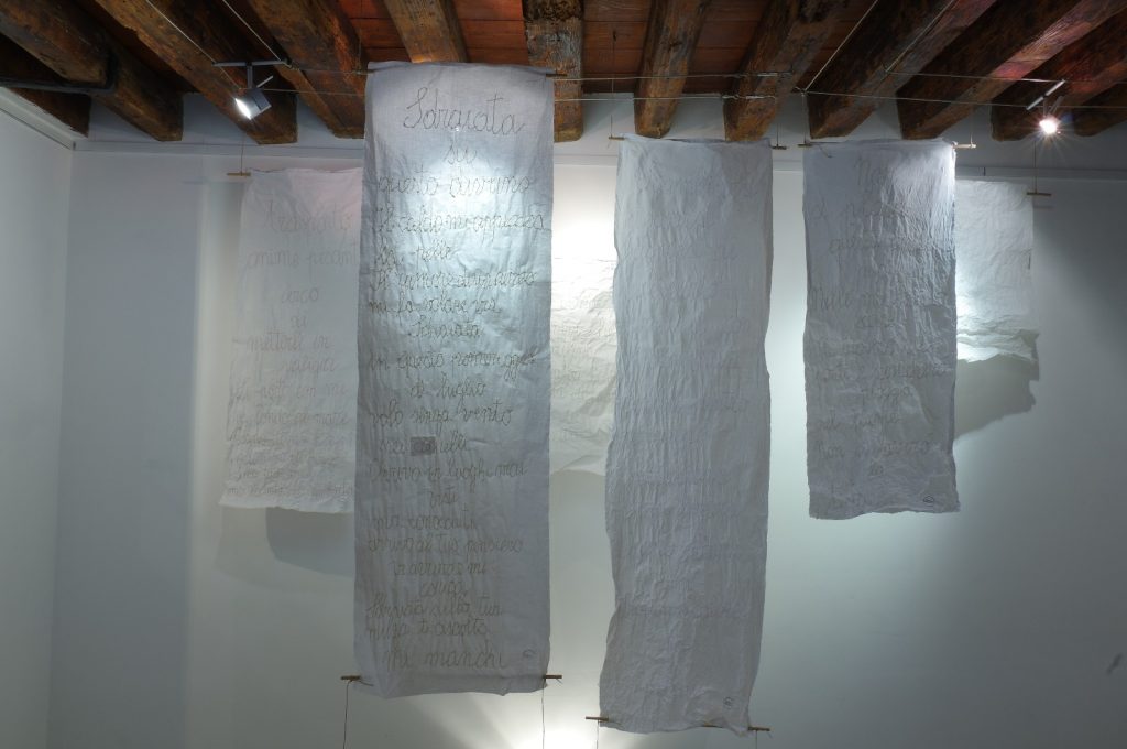 I suoi testi, trovando su teli e tessuti modo di divenire presenze.