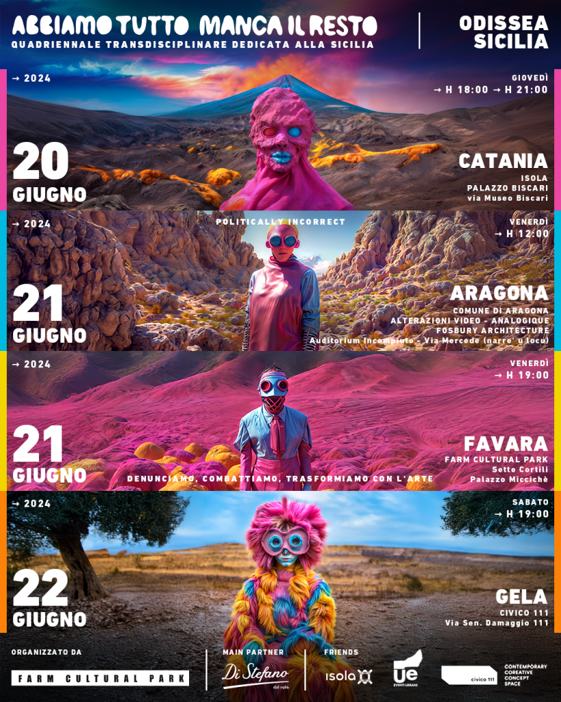 Denunciamo, combattiamo, trasformiamo con l’Arte. È questa l’ambizione di “Abbiamo Tutto Manca il Resto” la prima edizione della Quadriennale transdisciplinare diffusa dedicata alla Sicilia e organizzata da Farm Cultural Park con il supporto di Di Stefano, due realtà siciliane che nel corso di questi anni, in modi differenti, hanno cercato di raccontare la Sicilia contemporanea, lasciando da parte i luoghi comuni e gli stereotipi e dando spazio a chi ha scelto di restare in questa isola così controversa e di creare qualcosa di bello e di buono.