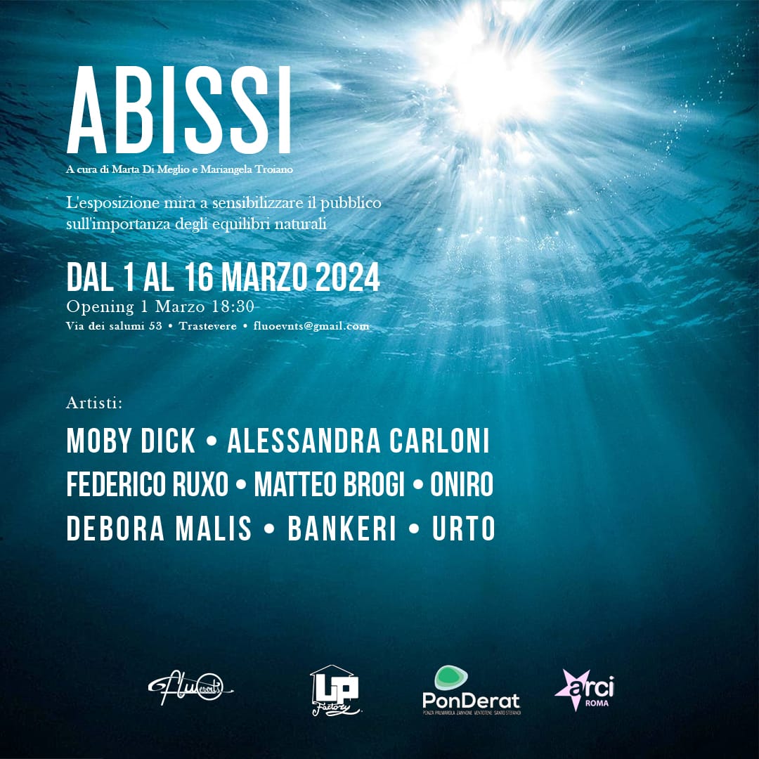 Up Urban Prospective Factory è lieta di presentare Abissi, esposizione collettiva a cura di Marta Di Meglio e organizzata con il patrocinio morale di Sea Shepherd e PonDerat. L’evento avrà luogo presso lo spazio espositivo di via dei Salumi 53 a Trastevere, venerdì 1 marzo dalle ore 18:30 e per l’occasione durante la serata ci sarà il dj set con PEPU.