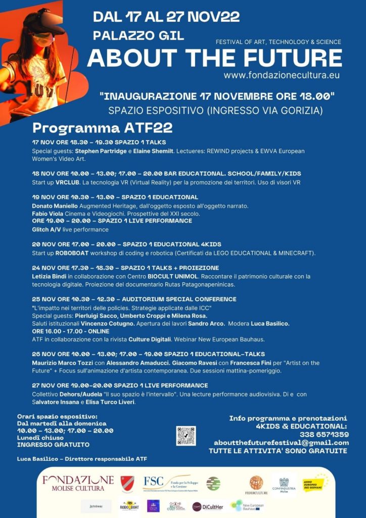 Torna in Molise About The Future, dal 17 al 27 novembre 2022 al Palazzo GIL di Campobasso, il festival che indaga il rapporto cross-culturale, la diffusione dei nuovi linguaggi artistici e le convergenze tecnologico-scientifiche derivate dalla cultura contemporanea. Il programma oltre alla sezione espositiva, prevede una serie di appuntamenti ed incontri dal profilo internazionale e specialistico nel contesto del management culturale e le policies di riferimento. Prodotto ed organizzato dalla Fondazione Molise Cultura con la direzione di Luca Basilico