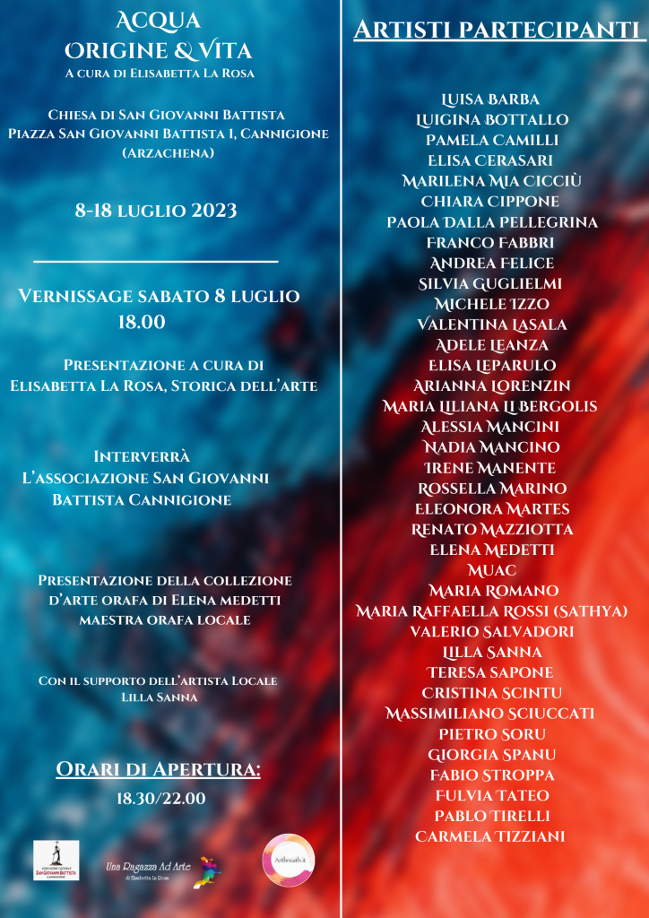 Nell’intelaiatura architettonica della Chiesa di San Giovanni Battista di Cannigione, dall’8 al 18 luglio, prende vita la mostra d’arte contemporanea Acqua – Origine & Vita curata dalla storica dell’arte Elisabetta La Rosa con il supporto organizzativo dell’Associazione culturale San Giovanni Battista di Cannigione ed il supporto della già nota artista Lilla Sanna, originaria di Cannigione.