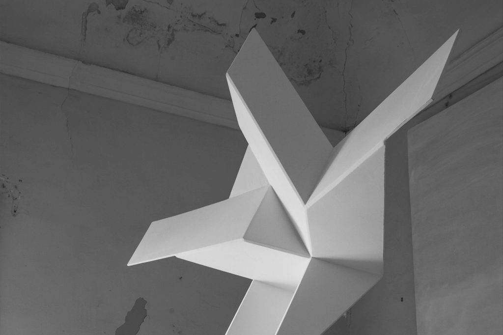 L’opera, progettata proprio per la Chiesa di Santa Maria dello Spasimo, si lega a doppio filo con il capolavoro di Raffaello, lo “Spasimo di Sicilia” (1517), oggi custodito al Prado di Madrid ma originariamente destinato alla chiesa palermitana. La dolorosa salita al Calvario, descritta con grande intensità dall’artista urbinate, si converte in una figurazione estremamente sintetica. Un incrocio destrutturato di bianchi volumi rievoca la forma del corpo sofferente del Christus Patiens e diviene schermo per la visione drammatica della Passione, che si eternizza nel tempo presente mettendo a nudo un conflitto umano e sociale in cui il tempo sembra arrestarsi, retrocedere e poi riprendere forma.