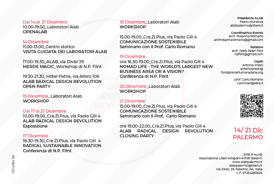 Dal 17 al 21 Dicembre, il Crezi.plus ospiterà ALAB RADICAL DESIGN REVOLUTION Exposition, raccolta di pezzi di design autoprodotti, ideati e realizzati dai designers ALAB, i quali presenteranno i loro lavori relativi al “radical and sustainable micro-living” del danese Flint. Progetti ed oggetti, legati ad un nuovo ed auspicabile, oltre che, oramai, improcrastinabile modo di vivere, volto alla sostenibilità di ogni gesto quotidiano.