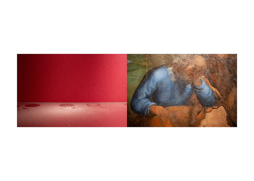 Alessandra Baldoni riflette sulla trasformazione e la persistenza del sacro e del sublime in una fase di passaggio, dove l’artista estrapola frammenti e isola dettagli di opere meravigliose mettendoli a confronto con strumenti semplici ma allo stesso tempo fondamentali di ogni trasformazione architettonica come un groviglio di cavi, una spina, un tassello nel muro, dei chiodi o un rotolo di pluriball.