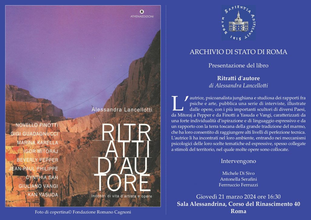 Giovedì 21 marzo 2024, a Roma, presso la Sala Alessandrina dell' Archivio di Stato, la Dott.ssa Alessandra Lancellotti Membro autorevole della International Association for Art and Psychology, presenta la seconda edizione del suo libro "Ritratti d'autore: incontri di vita d'artista e opere" edito da Athena (Pietrasanta).