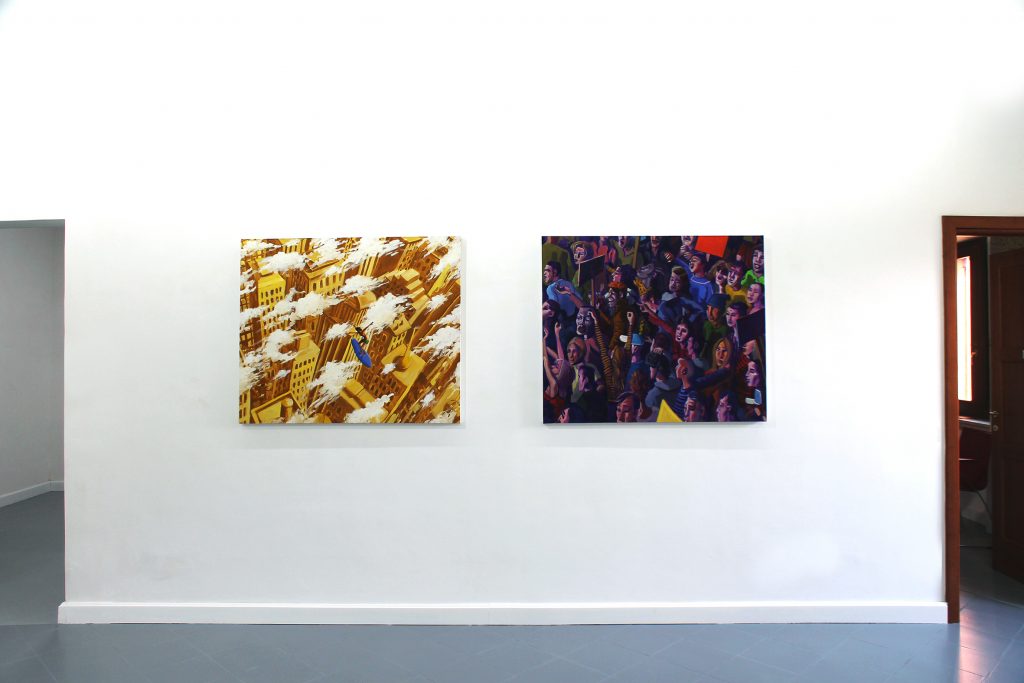In questo modo i miti si incrociano e si contaminano, il tempo si fa circolare e le età si fondono nella dimensione sincronica della pittura: Nausicaa e le Menadi diventano così le splendide donne africane che danzano nella foresta o si bagnano in acque verdi al tramonto, forse sulla stessa spiaggia dove passeggia Luigi Pirandello; Icaro vola su un surf librato sui grattacieli e Fetonte si trasforma nel Guido in giacca e cravatta che precipita sulle strade di una città deserta.