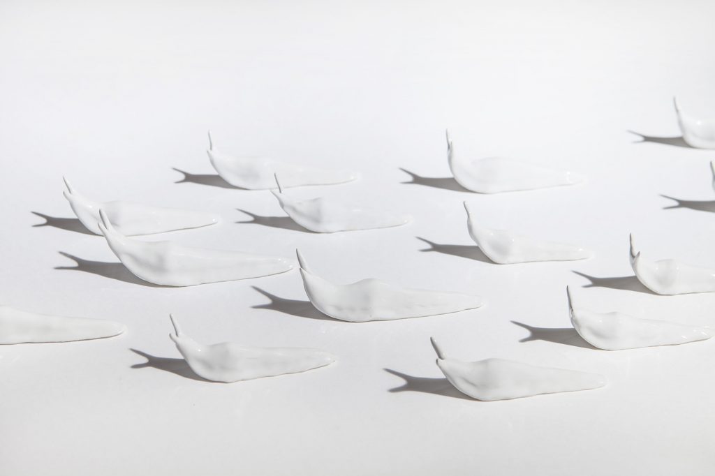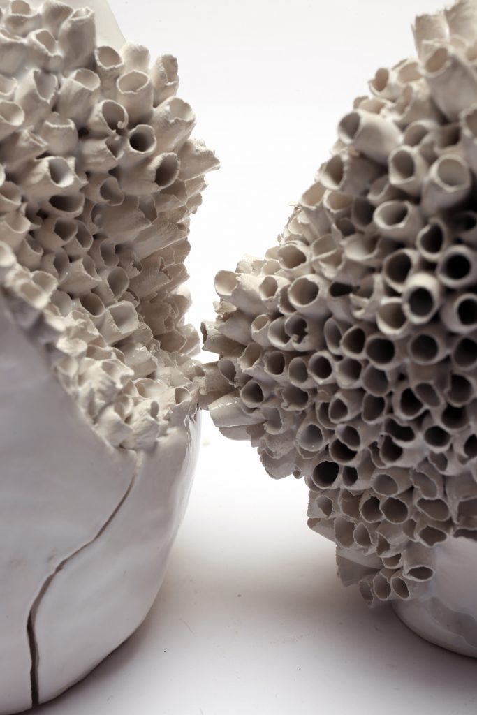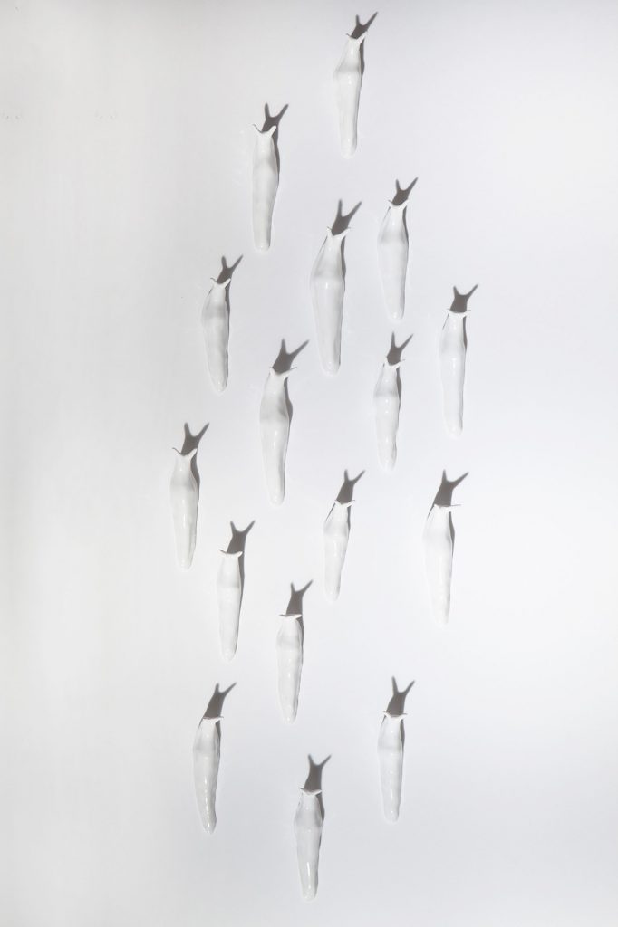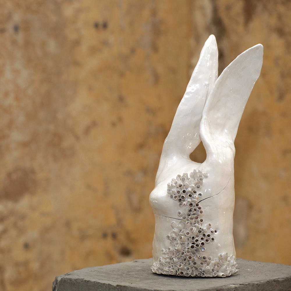 Ovvero il bestiario psichico; un popolo di animali metaforici che subiscono un processo di corruzione di sé. Sculture in ceramica bianca in cui l’individuo si genera e si corrompe al tempo stesso in una “tensione all’equilibrio”: una coesione dell’organismo tale da poter sopravvivere tra la tendenza a crescere all’infinito e quella entropica del distruggersi.