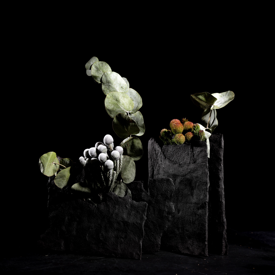“I vasi Nooja sono solo terra e fuoco, niente smalti o sofisticazioni. Nascono da un pensiero brutalista, ma hanno forme spontanee e irripetibili: è la terra stessa, che essiccandosi, prende la propria forma, tra rotture e pieghe”. La mostra si apre con un paesaggio naturale fatto di terra fresca e fiori essiccati: dal terreno emerge la foresta di lastre grezze e accuminate dei vasi Nooja.