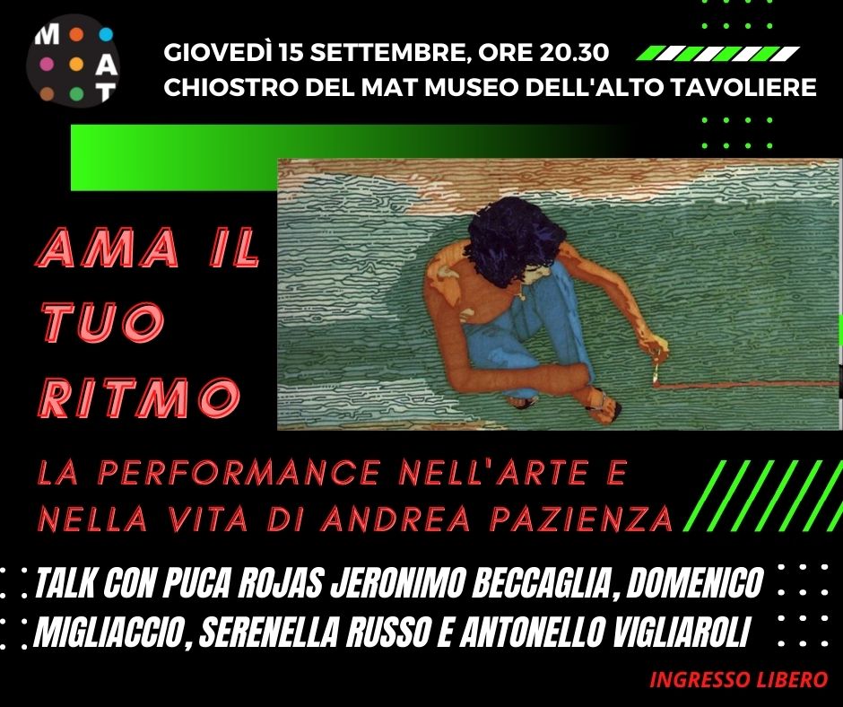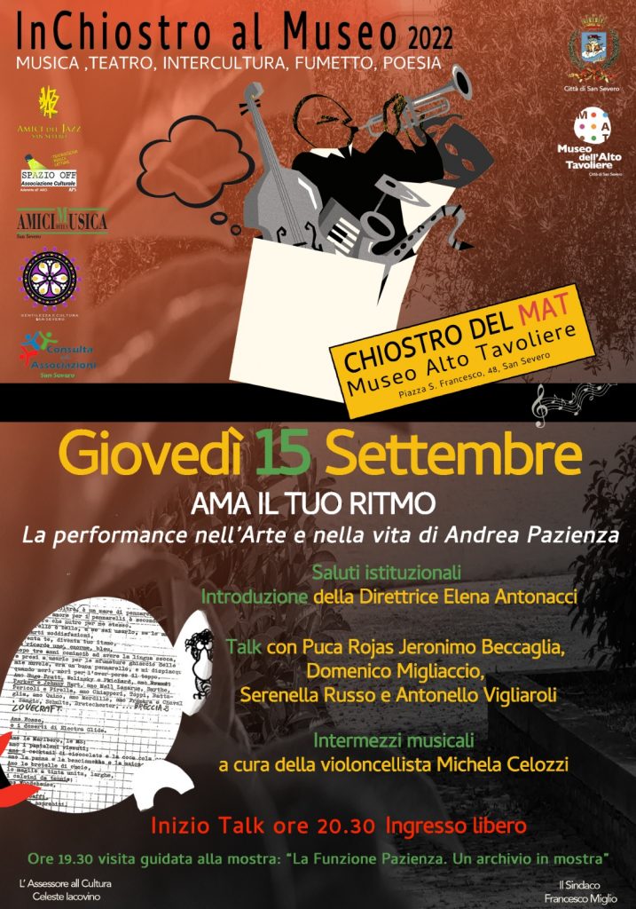 Evento finale dell'esposizione didattica “La funzione Pazienza. Un archivio in mostra”, il talk prevede le relazioni di: Puca Rojas Jeronimo Beccaglia, storico dell’arte; Domenico Migliaccio, studioso, Serenella Russo, operatrice volontaria del progetto di Servizio Civile Universale presso il MAT. Modera Antonello Vigliaroli, operatore culturale del MAT Museo dell'Alto Tavoliere, curatore del centro di documentazione SPLASH Archivio ‘Andrea Pazienza’