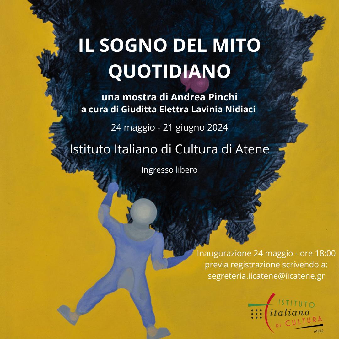Inaugura Venerdì 24 maggio alle ore 18, presso la sede dell’Istituto Italiano di Cultura di Atene, la mostra personale di Andrea Pinchi dal titolo Il sogno del mito quotidiano, a cura di Giuditta Elettra Lavinia Nidiaci. L’esposizione si compone di un corpus di diciotto tele realizzate con pittura acrilica, in alcune delle quali è presente l’inserimento di pelle proveniente da organi musicali antichi. Il filo conduttore della mostra è senz’altro quello dell’esaltazione della dimensione onirica, da sempre strettamente connessa a quella mitologica, ma anche di come questa possa essere applicata al tempo odierno, non solo inteso come contemporaneità, ma anche, in maniera più prosaica ma non per questo diminutiva, come quotidianità, come collettività concepita come somma delle individualità.
