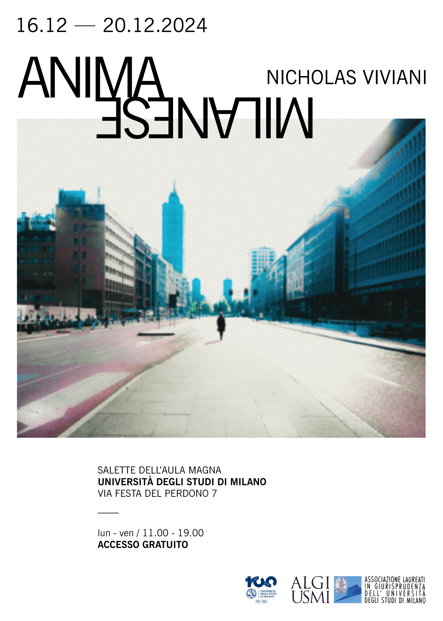 Nell’ambito delle celebrazioni per i Cento Anni dell’Università degli Studi di Milano, l’Associazione Algiusmi propone nelle Salette dell’Aula Magna, dal 16 al 20 Dicembre, la mostra “Anima Milanese”, del fotografo Nicholas Viviani, Alumno dell’Ateneo.