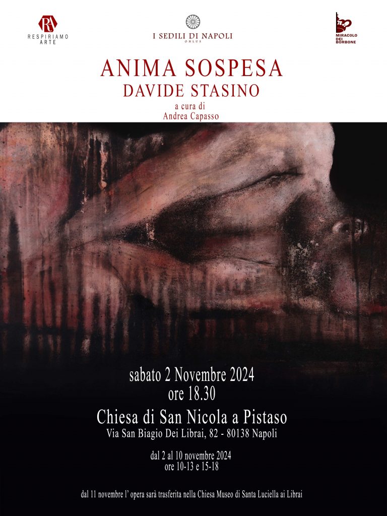 02 novembre 2024, alle ore 18.30, presso la Chiesa di S. Nicola a Pistaso, Via San Biagio Dei Librai n°82, Napoli. Sarà presentato il progetto : Anima sospesa di Davide Stasino. La mostra resterà aperta dal 2 novembre al 10 novembre 2024 con i seguenti orari: dal martedì alla domenica ore 10-13 e 15-18.