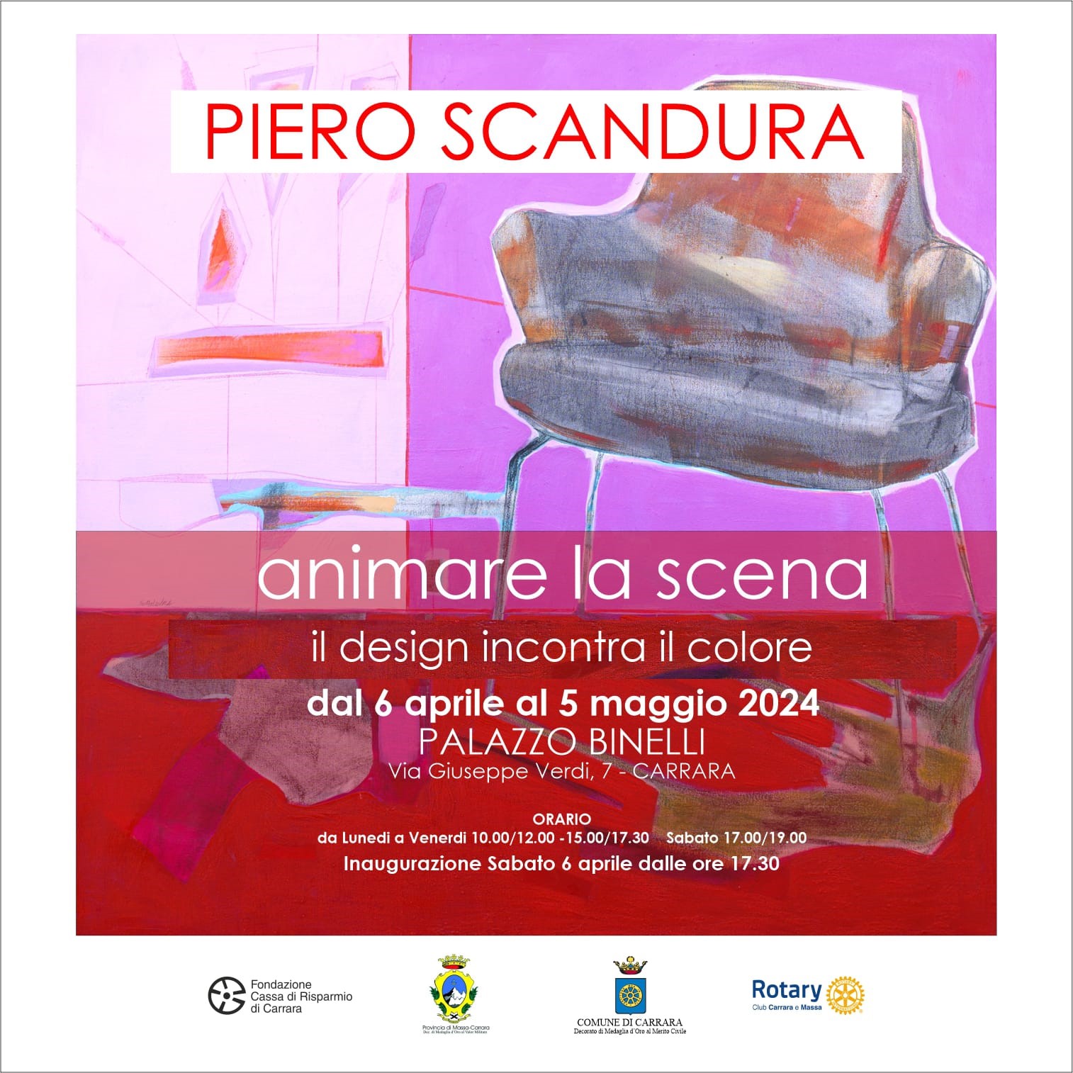 In mostra sono esposte una trentina di opere di Piero Scandura realizzate dall’artista negli ultimi sei anni. Duplice è la lettura del filo conduttore di Animare la scena, da una parte troviamo la forma data dall’oggetto di design, dall’altra troviamo lo spazio pittorico. E così ogni lavoro è dedicato a una particolare forma di arredamento e design: le sedute; dalla semplice sedia, alle poltrone, dai divani alle chaiselongue. E anche se è l’oggetto ad essere sempre predominante, non si può però affermare che lo spazio, fatto di linee e colori, passi in secondo piano o sia solo una scenografia. Gli spazi sono infatti ampi e colorati, estremamente colorati, talvolta spogli