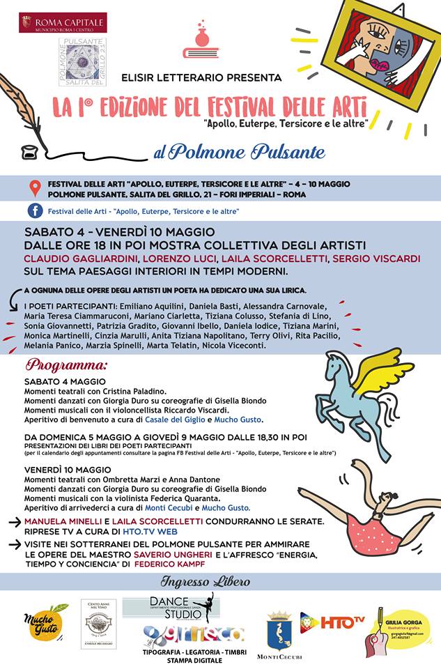 Quattro artisti della tavolozza per un totale di ventidue opere d’arte, ad ognuna delle quali uno dei ventidue artisti della penna…poetica, ha dedicato una poesia inedita, tre attrici teatrali, un violoncellista, una violinista e una magnifica danzatrice. Questi i numeri e i personaggi della I edizione del Festival delle Arti “Apollo, Euterpe, Tersicore e le altre” organizzata dall’associazione culturale Elisir Letterario, che si terrà nello spazio espositivo del Polmone Pulsante, proprio di fronte ai Fori Imperiali, da sabato 4 maggio fino a venerdì 10 maggio, dalle ore 18 alle 22.