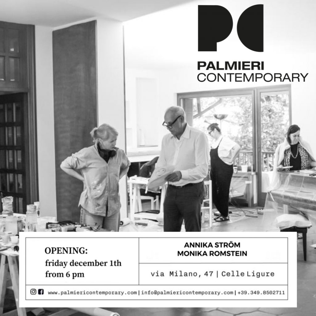 Dal 1 dicembre 2023 al 29 marzo 2024 con Annika Ström e Monika Romstein torna la mostra frutto di “Appuntamento con l’Artista”, il progetto di residenza ideato da Paolo Palmieri e Maria Antonietta Collu per gli spazi di Palmieri Contemporary. Un appuntamento vissuto come un'opportunità, risultato di una scelta appassionata e coraggiosa «Una piccola finestra sul mondo dell'arte contemporanea in un piccolo comune, Celle Ligure, lontano centinaia di chilometri dagli scintillanti ritrovi dell'arte» afferma Maria Antonietta Collu.