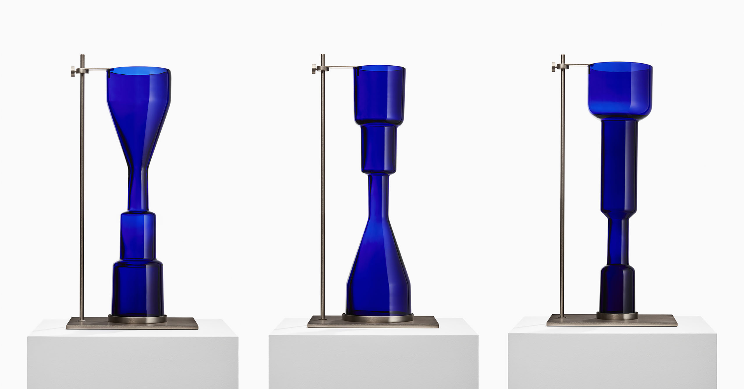 Il blu oceano satinato e il cristallo trasparente degli oggetti (fornace Simone Cenedese), si alternano alle fotografie stampate in grande formato, che portano dentro il calore, il lavoro, la grande maestria muranese. Sono immagini scattate negli anni Cinquanta e Sessanta da Luigi “Gigi” Ferrigno che per tutta la sua vita ha lavorato proprio nelle fornaci dell’isola.