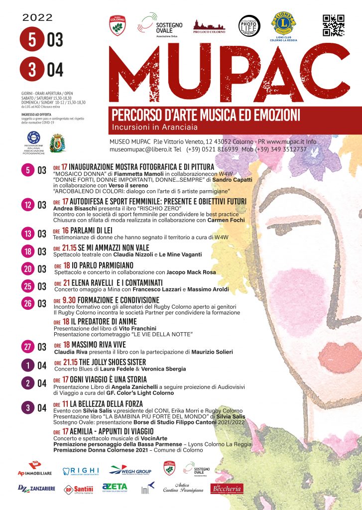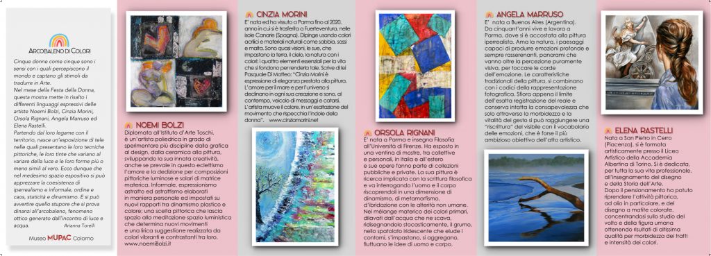 Sabato 5 marzo 2022 alle ore 17.00, negli spazi del MUPAC (Museo dei Paesaggi di Terra e di Fiume), all’interno della settecentesca Aranciaia di Colorno (PR), verrà inaugurata la collettiva dal titolo “Arcobaleno di colori: dialogo con l’Arte di 5 artiste parmigiane”. Visitabile fino al 3 aprile