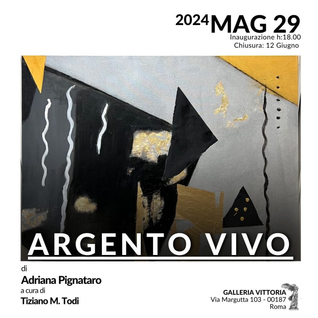 La personale dell’artista Adriana Pignataro dal titolo "Argento Vivo", curata da Tiziano M. Todi, dal prossimo 29 maggio al 12 giugno 2024 , avrà luogo presso la Galleria Vittoria, in Via Margutta 103 a Roma.