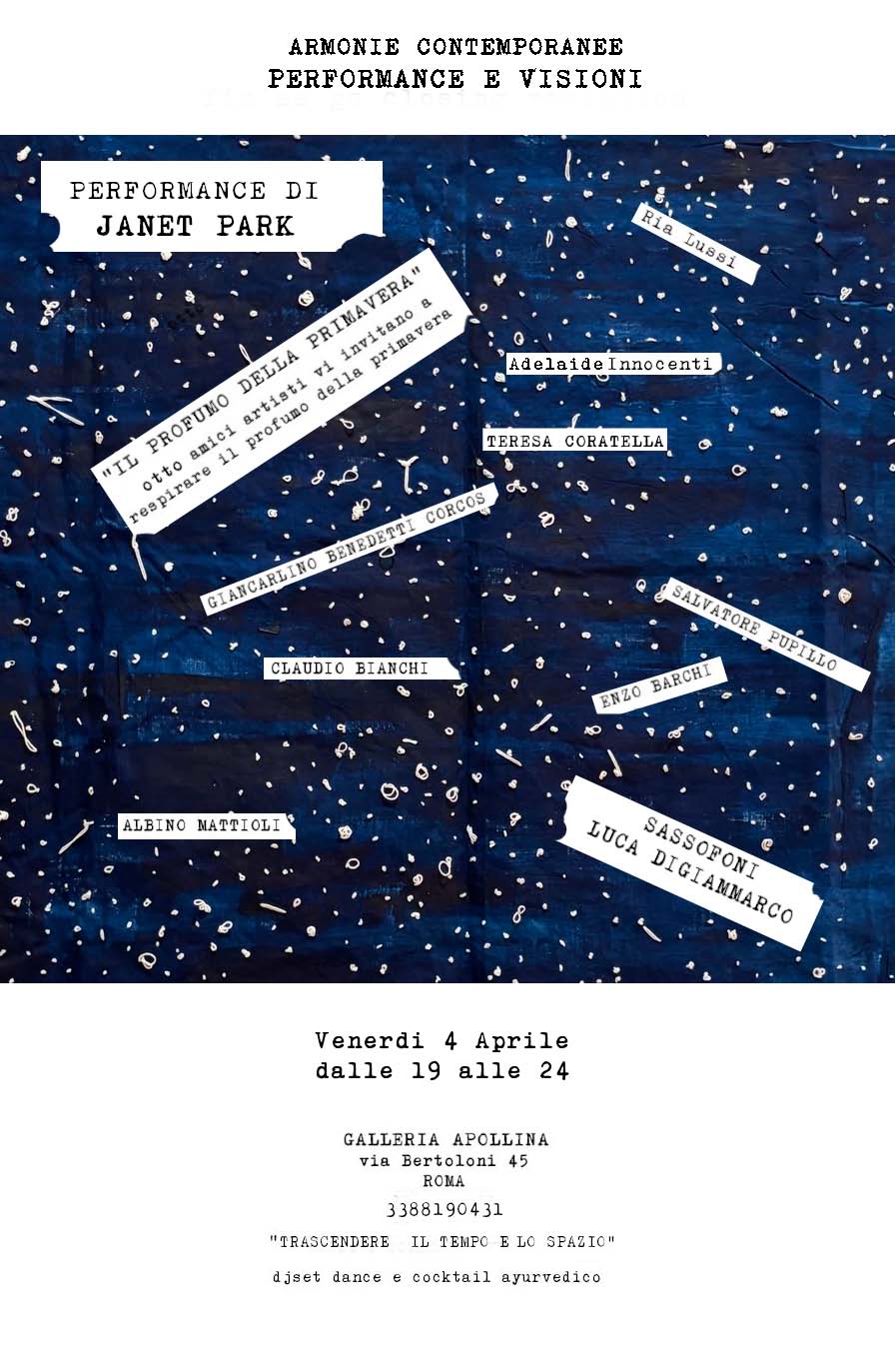 L’occasione è la mostra collettiva di arte contemporanea “Il profumo della Primavera”, in corso a Roma alla Galleria Apollina in Via Bertoloni 45 e aperta oggi, venerdì 4 aprile, alla sera, dalle 19.00 alle 24.00 nell’evento “Armonie contemporanee: performance e visioni”, con performance di Janet Park, appunto, e musica affidata al sax di Luca di Giammarco.
