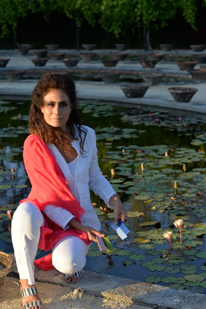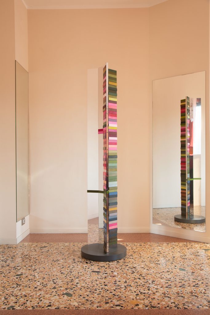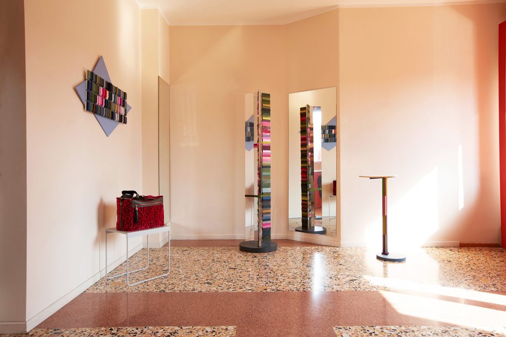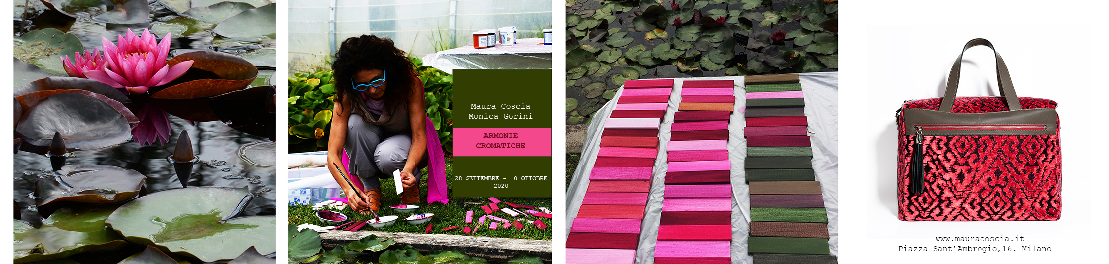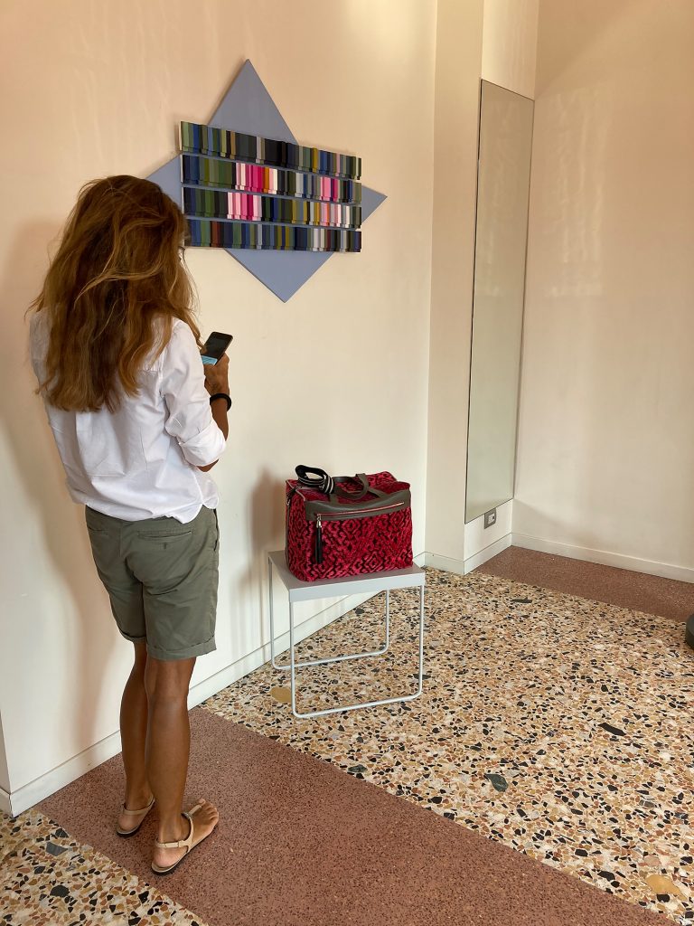 C’è un dialogo tra le composizioni a palette di Monica Gorini e i prodotti di alta artigianalità di Maura Coscia. Le sculture esibiscono sfumature di ninfee, interpretate spesso nel loro elemento essenziale, il fiore. I tasselli geometrici raccontano un susseguirsi di immagini mutevoli come i petali che ogni variazione atmosferica, il passaggio di una nuvola, il riflesso del cielo, rendono sempre diversi, cangianti. Così come la trama del borsone di velluto riccio, velluto tessuto nella Venezia del Settecento e per questo detto riccio, con una manifattura di pregio. Essa ricorda il gesto che apre il fiore, lo sgranarsi nel suo modulo base, il petalo, ripetendo le sue forme, le sue trame, i suoi decori. L’oggetto racconta, all’interno del suo narrare attraverso l’arte, proprio quel modulo il suo ripetersi senza fine con eleganza, raffinatezza e rimandi quasi sensoriali.