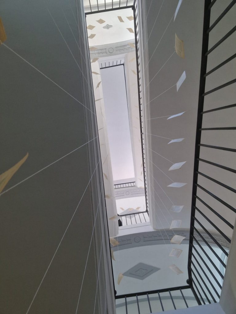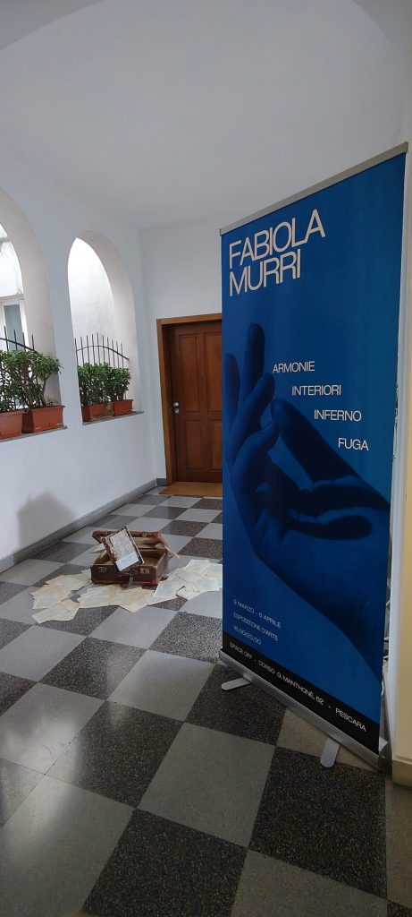 Lo spettatore è accolto da una installazione che nasce da un processo di riscrittura spontanea, un atto creativo attraverso un’estrazione libera di parole e piccole frasi di senso compiuto che, sospese, creano una narrazione parallela del testo dantesco offrendo una forma nuova e un lettura inattesa. Questa scelta scenica rappresenta il movimento tra la sofferenza e la ricerca di una via di fuga, una narrazione visiva che spinge il visitatore a confrontarsi con le proprie emozioni.