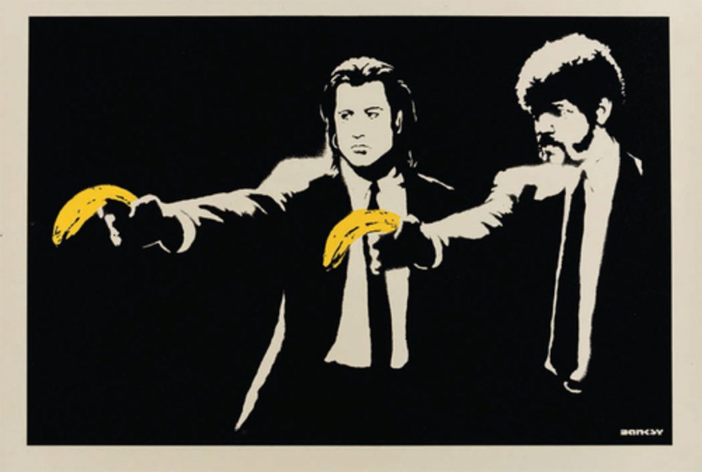 Un percorso narrativo irriverente ed originale quello voluto dai galleristi Raffaella Rossi e Filippo Restelli, che inizia al pianterreno dove in vetrina non si può non ammirare il “Pulp Fiction” di Banksy, omaggio all’omonimo film di Quentin Tarantino. Nell’opera dello street artist più famoso al mondo, i protagonisti Samuel L. Jackson e John Travolta impugnano banane al posto di pistole. Ai suoi piedi, la scultura dell’artista S. Coz, “Urban Bull”; il bulldog ha la zampa alzata, come a voler irriverentemente fare i bisogni proprio sull’opera di Banksy, mettendo in scena un dialogo immaginario su cosa sia o voglia essere la street art, opposizione al mainstream o contemporanea conquista dello stesso, impegno politico o militanza combattuta a colpi di ironia. Si prosegue con “Best Friends Forever” di Skiri, l’artista gioca con le icone del film di Tarantino stravolgendone l’indole e trasformando Samuel L. Jackson e John Travolta in due moderni angeli custodi che si ergono a difesa dell’iconico cartoon Titti, che abbandona i panni del fragile e dolce canarino per trasformarsi in uno spietato criminale, ritratto con tanto di pistole.