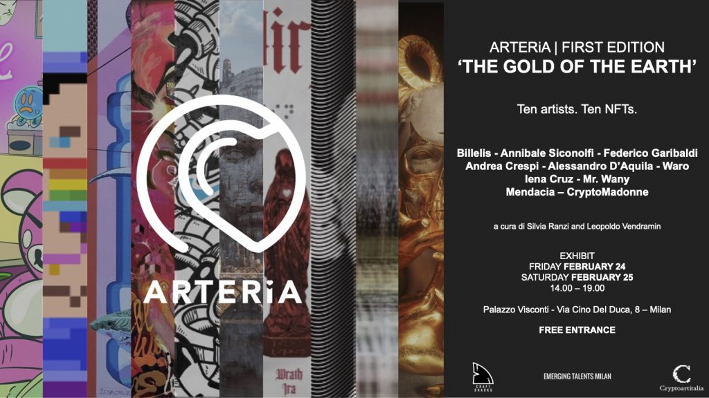 A partecipare alla prima edizione di ARTERiA saranno: Federico Garibaldi, Andrea Crespi, Alessandro D’Aquila, Waro, Mendacia, CryptoMadonne. Minteranno il loro primo NFT Iena Cruz e Mr. Wany.