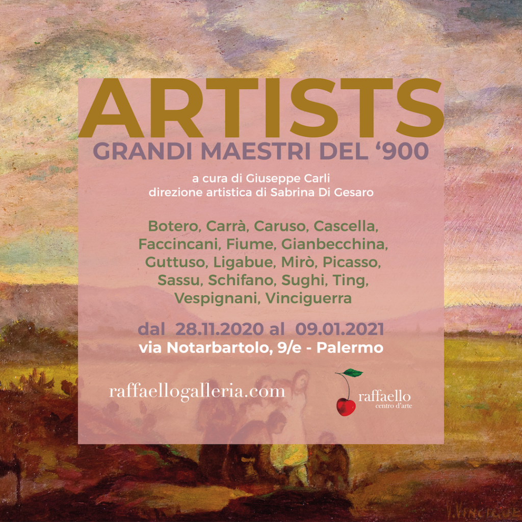 Il Centro d'arte Raffaello, diretto da Sabrina Di Gesaro, in prossimità delle festività natalizie offrirà al pubblico una collettiva di grande pregio, a cura del critico d’arte Giuseppe Carli, dal titolo “ARTISTS” e riunirà opere uniche e grafiche di grandi artisti appartenenti alle più importanti correnti del ‘900 come: Botero, Carrà, Caruso, Cascella, Faccincani, Fiume, Gianbecchina, Guttuso, Ligabue, Mirò, Picasso, Sassu, Schifano, Sughi, Ting, Vespignani, Vinciguerra. L'esposizione avrà inizio sabato 28 novembre ore 18:00 negli spazi di via Notarbartolo 9/e a Palermo