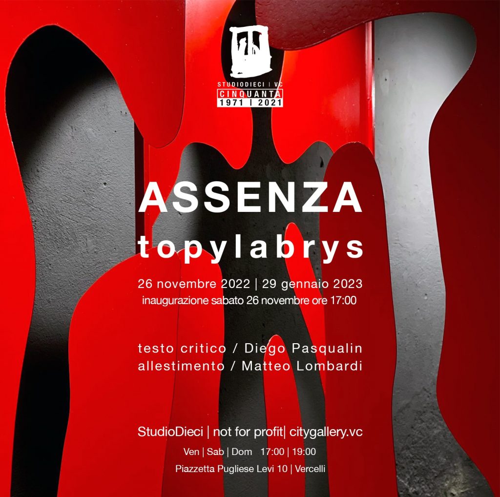 La personale dell’artista milanese topylabrys, dal titolo ASSENZA, è un progetto importate che raccoglie l’ultima produzione della nota scultrice e alcune opere già storicizzate. Nella sua ricerca la sperimentazione dei materiali è sempre stata di primaria importanza; ogni opera è frutto del recupero di scarti industriali e aziendali che, sotto le sapienti mani di topylabrys, hanno trovato nuova vita e collocazione. Le materie plastiche inizialmente e ora anche il metallo sono i tasselli di un discorso che vede l’artista coinvolta a livello sociale, dapprima con la fondazione dell’associazione Arte da Mangiare Mangiare Arte (avvenuta a Milano nel 1996), dove le tematiche legate all’alimentazione e all’utilizzo sostenibile della coltivazione e del cibo hanno portato topylabrys ad occuparsi del MAF Museo Acqua Franca (2011), sito all’interno del Depuratore di Milano Nosedo, per promuovere e sensibilizzare la popolazione sulle problematiche ambientali ed ecologiche sul trattamento delle acque reflue.