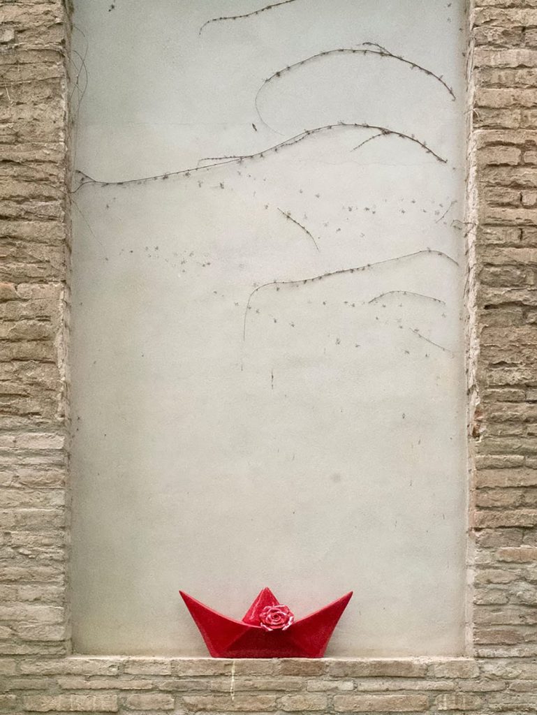 Ecco allora che le barchette di carta, inaffondabili nell’immaginario infantile, diventano di ceramica e trasportano la speranza di un approdo, la consapevolezza di non essere un rifiuto, l’augurio di un’accoglienza che urla dignità e giustizia sociale. Barche che nel loro tragitto incontrano gabbiani e colombe, simboli di esplorazione, di libertà, di pace. E incontrano cuori, simboli di amore.