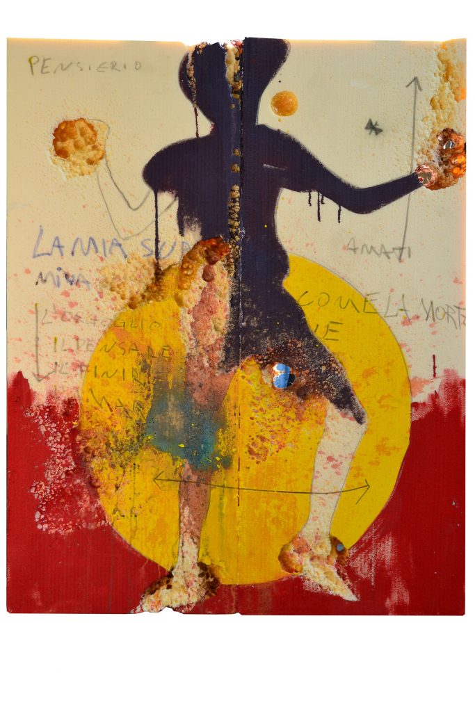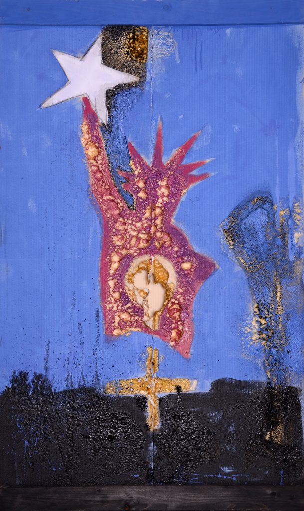 In una continua ricerca di corrispondenze tra sacro e umano, tra divino e terreno, l'opera emblematica da cui la mostra deriva il proprio titolo è una sorta di pala d'altare in chiave contemporanea, un lavoro imponente dove un vuoto silenzioso viene interrotto da un nuovo principio: AVE, un saluto auspichevole che porta con sé un augurio benevolente, una preghiera alla donna sacra per propria natura, una richiesta di protezione contro ogni forma di prevaricazione, un'invito alla pace dentro e attorno a noi. Uno sguardo rivolto lontano, quello di una giovane donna che, lungo il proprio cammino, sa di poter contare sul sostegno di un uomo. Segni di ferite che non provocano più dolore e corpi saldi che esprimono un ritrovato bilanciamento tra emozioni, mente e spirito e la comprensione profonda che l'emancipazione dai problemi dell'umanità nasce da un'impegno personale verso il bene espresso in ogni piccolo gesto.
