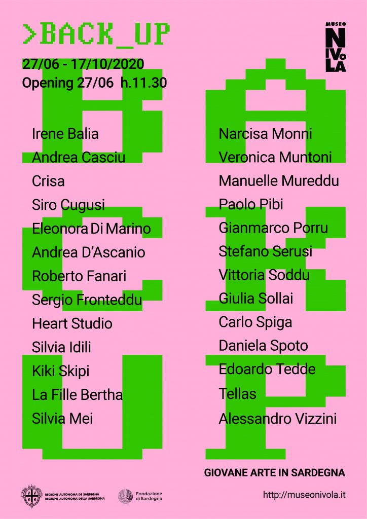 Back_Up. Giovane arte in Sardegna è un progetto espositivo che coinvolge 27 artisti nati in Sardegna, sotto i quarant’anni. Si tratta di una ricognizione delle nuove generazioni creative dell’isola che non ha precedenti per estensione e scopo.