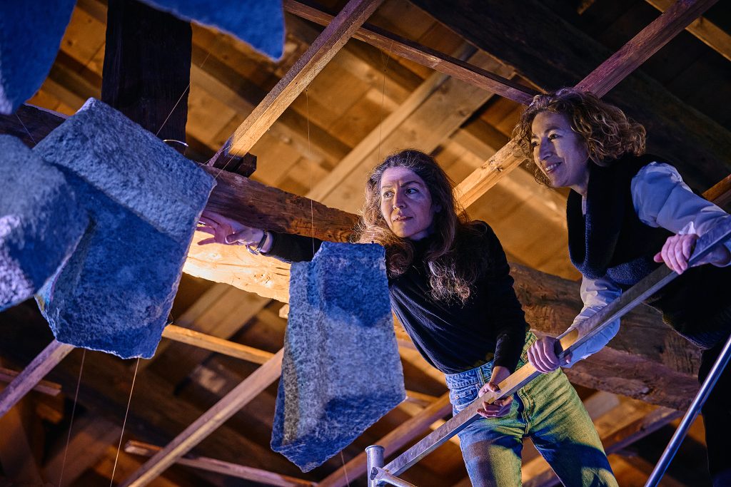 Cuore dell’esposizione è la grande installazione immersiva realizzata nella Sala Labia del Castello Scaligero. Al centro della sala, a terra, un video ritrae l’artista sdraiata, schiacciata da un’enorme pietra. Sopra il corpo di Heidarzade sono sospese decine di pietre. I visitatori possono sentire il peso mentale di quelle pietre scagliate, ma bloccate in aria. «Ancora mani che lanciano pietre. Ancora donne vittime di atti di violenza», spiega la curatrice Marina Pizziolo. «Dobbiamo imparare ad ascoltare le parole di quelle donne, prima che diventino grido. Solo così potremo fermare quelle pietre, scagliate in nome di qualcosa che non possiamo chiamare amore. E farle rimanere sospese, in volo. Siamo noi, insieme, a poter trasformare le pietre in aquiloni».