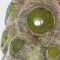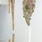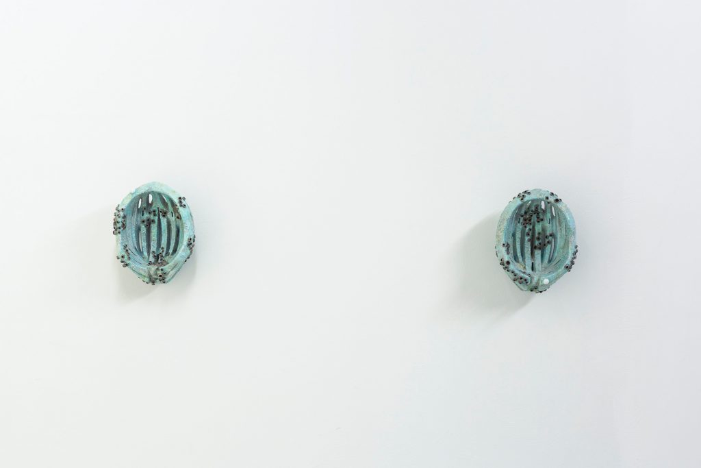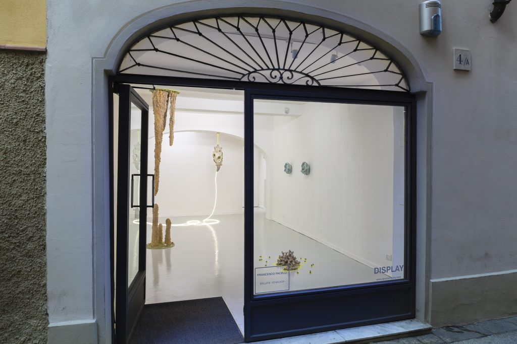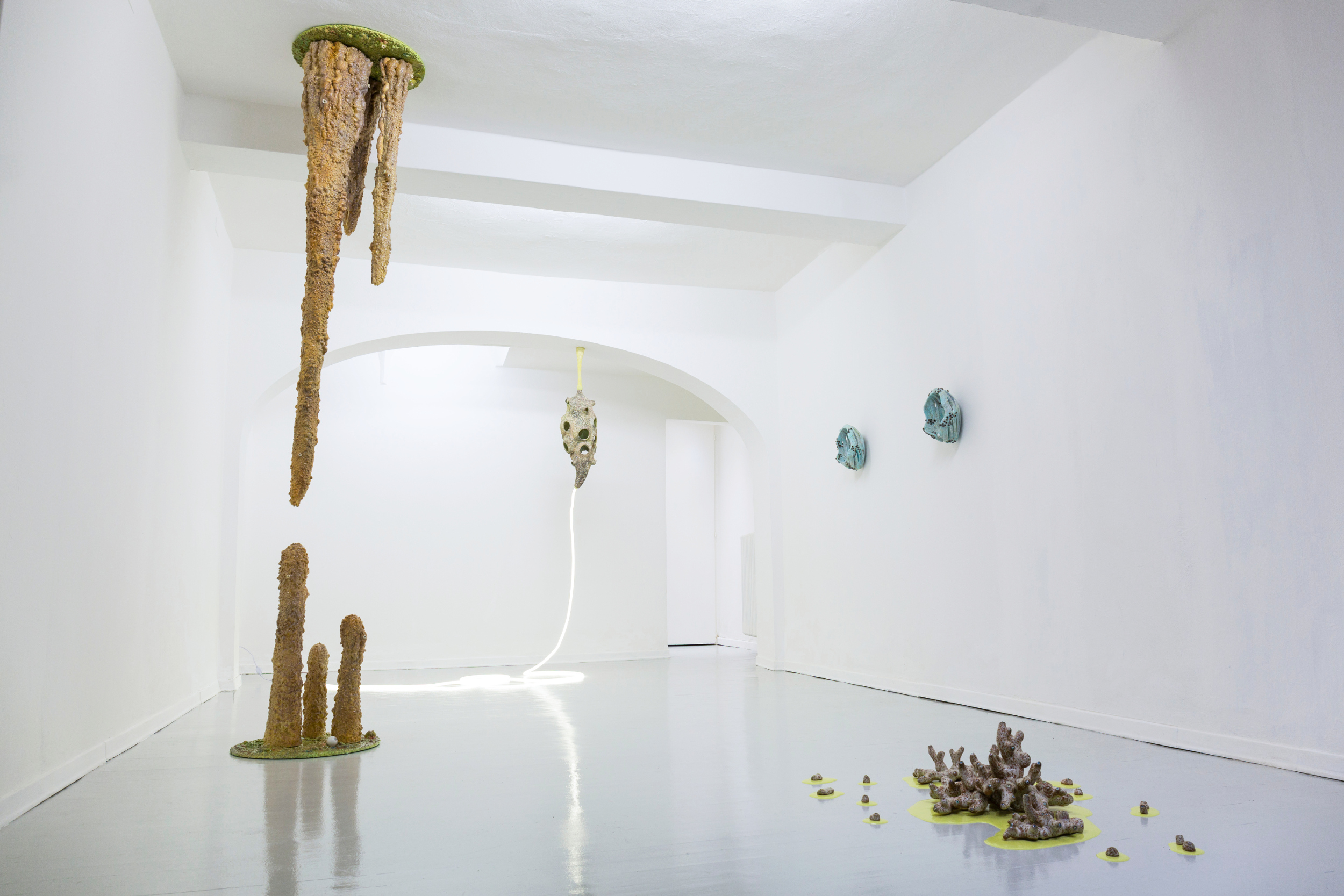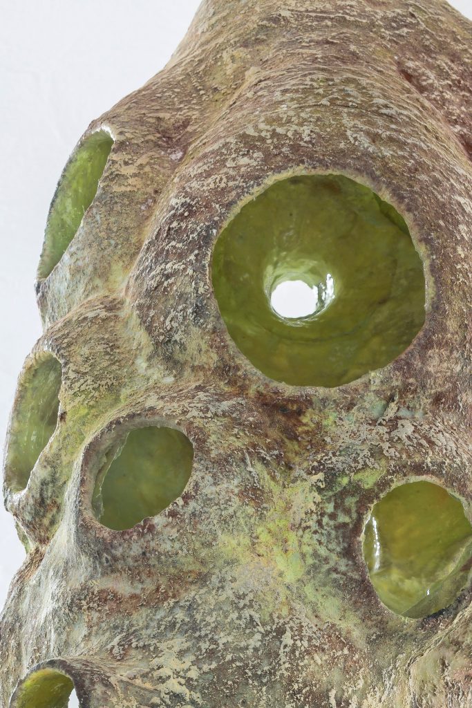 Il Vogelkop bowerbird, uccello tipico della Nuova Guinea, è in questo senso una figura paradigmatica: nell’utilizzo di oggetti di diverse provenienze (quali frammenti di scarti industriali e materiali organici) a scopo seduttivo e decorativo sia nel rituale di corteggiamento che nella costruzione del nido, compie un salto evolutivo tale da essere considerato una specie particolare, differente dalla famiglia di appartenenza. È la figura scelta come metafora di uno scenario che Francesco Pacelli immagina creando un ambiente verosimile ma possibile, dove convivono specie meticciate in cui biologia e tecnologia sono fuse – e confuse – in nuove creature (o creazioni) tecnorganiche, intese come costrutti socio-culturali. Un nido-termitaio vuoto (The anachronism of the species makes us very fragile) dalla superficie squarciata apparentemente sorretto da una propaggine filiforme luminosa, un gruppo di ibride stalattiti e stalagmiti (Cas9) le cui sedimentazioni millenarie hanno generato dei denti, alcuni coralli (Exodus) dotati di minuscoli bulbi oculari che, staccatisi dal corpo, si diffondono viralmente come microprotesi esploratrici – o forse predatrici – di un habitat che la rapidità di trasformazione rende continuamente alieno, due calotte plastiche (The tripophiles), forse dei primordiali caschi per viaggi virtuali oppure esoscheletri calcificati in attesa di organi, convivono con presenze invisibili che si palesano con rumori e suoni disarmonici nella trama ritmica della caduta libera di una goccia che si riverbera nello spazio (Contemporary soup). In questo paesaggio una pallina da ping-pong, rassicurante traccia del nostro tempo, ci riporta al presente. Un oggi in cui la transazione da organismo a cyborg è già avvenuta e «gli organismi biologici sono diventati sistemi biotici, strumenti di comunicazione come qualsiasi altri» (1). Irriducibilmente eretici, si sottraggono alle rigide definizioni già date e, seppure condizionati, sono in grado di condizionare a loro volta la nostra visione del mondo come «risorse immaginative ispiratrici»(2). Il diorama di Francesco Pacelli ne è una riproduzione da laboratorio realizzata con materiali eterodossi – resina, pigmenti, smalti industriali, ceramica, luci led – trattati utilizzando tecniche miste – il modellato tradizionale insieme a strumenti di fabbricazione digitale propri del contemporaneo. Tecnologia, industria e artigianato si incrociano anche sul piano realizzativo nella sperimentazione di saperi pluridisciplinari e di pratiche in cui l’oggetto è luogo di iscrizione complessa e ibrido tra materia e linguaggio.