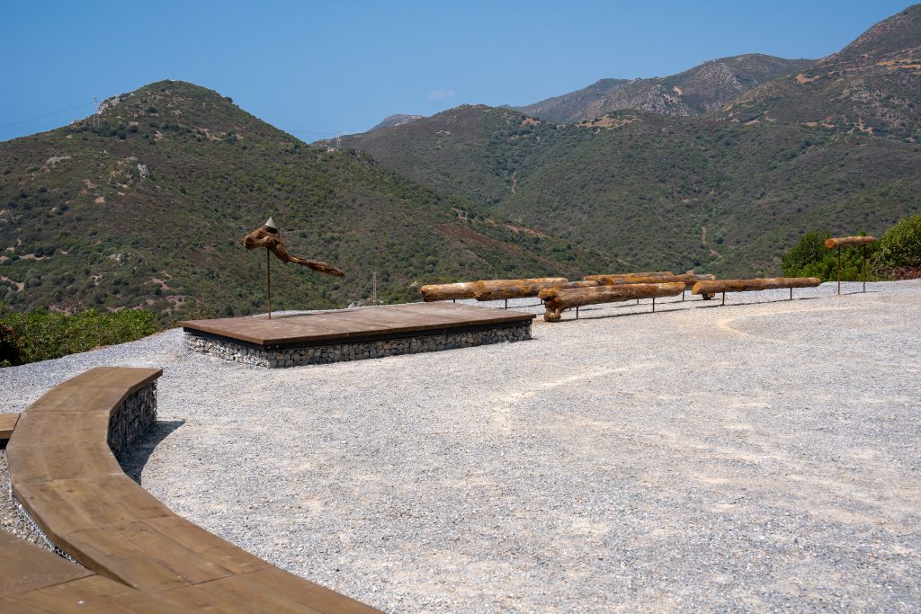 L’opera è composta da due parti: verso la montagna una seduta semicircolare di blocchi di pietra di scavo, che riprende le sedute megalitiche delle capanne delle riunioni dei villaggi nuragici;