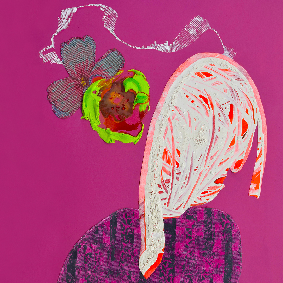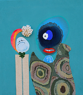 Per fare ciò, l’artista usa colori vividi e tessuti vari componendo elementi astratti e simbolici che producono un pattern visivo intrigante per l’attenzione dell’osservatore e lo invita al dialogo con il messaggio implicito nell’opera.
