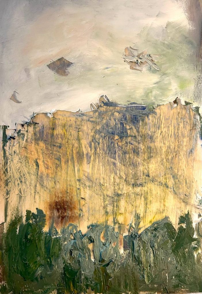 “Il Blu ha proprietà antisettiche, astringenti e anestetizzanti: si usa in tutti i sintomi che sviluppano calore, in quelle patologie durante le quali il sangue si affastella nei capillari, cercando febbrilmente una via per fuoriuscire dal corpo. Per Barilaro, arriva quasi salvifico, dopo che il rosso ha conquistato la mente e l’ha travolta, consumandola con il fuoco sacro dell’ispirazione. Nel tempo dell’intima riflessione, dell’ode alla bellezza della donna e alla pace dello spirito, architetture di epoche rinascimentali accompagnano lo sguardo sino al cielo. Blu. Elegante, dal passato nobile, appare delicatamente nelle tele, per diminuire la pressione arteriosa, calmare il ritmo respiratorio e i battiti del cuore. Quel leggero chiarore che precede l’alba, nell’abbraccio asessuato delle onde del mare, è la metafisica rappresentazione del logos, non a caso l’azzurro è usato anche per individuare il chakra della gola. L’algida pazienza del freddo si concilia con la vecchia angoscia di paragonarsi ai grandi del passato. Anabasi vana, intesa, non già come imitazione di quanto visto a Firenze o a Urbino, né di grottesco riferimento, ma come capacità di individuare, mostrare e separare ciò che è stato velenoso, nocivo da quello che non lo sarà. Opere che diventano un lampo alchemico purificatore, che confonde in umane miserie le ali squarciate di demoni e cherubini, intingendo le prime di quiete, le seconde di dubbi spaventosi”.