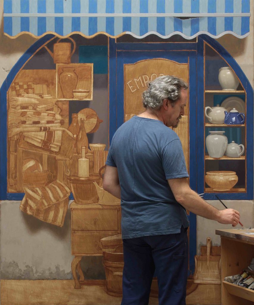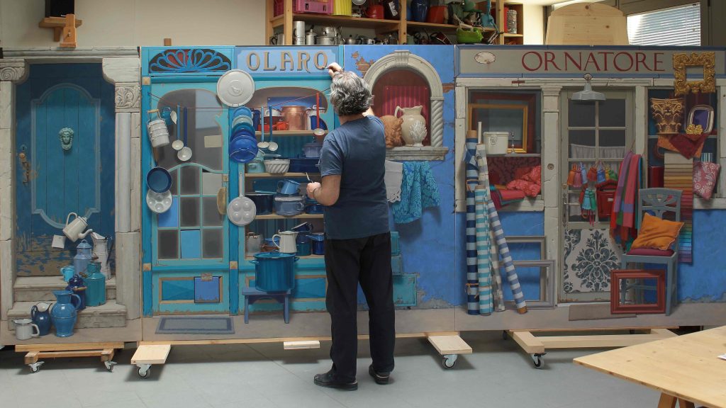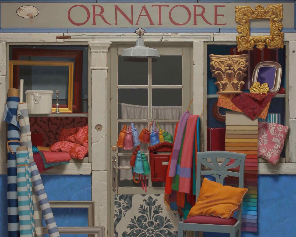 Cinque tavole di oltre 6 metri di lunghezza: una composizione scenografica di oggetti di uso comune e botteghe dal sapore antico, come l'olaro, l'ornatore , l'emporio, restituiti in pittura in modo sorprendentemente fedele.