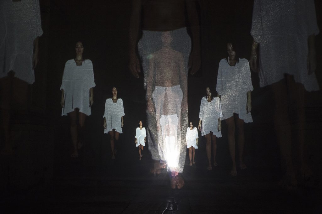 La videoinstallazione, attraverso una serie di schermi olografici disseminati all’interno del Sedile di Sant’Anna, crea uno spazio immersivo nel quale lo spettatore è libero di addentrarsi; l’opera concentra in sé la volontà di far risaltare quel bene che ognuno possiede, invitando il visitatore a instaurare un’interazione empatica con quello che accade all’interno dell’ambiente. Una schiera di “uomini di luce” si materializza sugli schermi sospesi. Le figure comunicano, compiono gesti, avanzano verso l’osservatore. Corpi evanescenti, provengono dal buio, a ricordare quel buio che li ha inghiottiti; si “ripetono” nel tempo e nello spazio (dal lat. repetĕre, ossia “dirigersi di nuovo verso qualcuno”), si stratificano e dirigono verso lo spettatore il cui punto di osservazione genera una sorta di isotopia della visibilità: i corpi appaiono e scompaiono a seconda della posizione dell’osservatore e, a seconda del suo punto di vista, si sovrappongono l’un l’altro. L’immagine insiste, imprime una traccia nella memoria, nella percezione del fruitore. Chi osserva si interfaccia con un ipotetico alter ego immateriale, ascolta il suo lamento silenzioso, inudibile ma percepibile. All’immagine dell’uomo si alternano parole tratte da alcuni testi cantati nei campi di concentramento. Il titolo dell’opera “Canto della Primavera del ‘44”, trae ispirazione dal “Canto di Hammerstein” conosciuto anche come “Inno dei prigionieri italiani di Hammerstein”, il cui autore si identifica nella figura del tenente Lorenzo Lugli. Per i musicisti dell’epoca, comporre musica e parole, ha rappresentato l’unica possibilità di conservazione e rinnovamento di quella libertà tipica di una coscienza che chiede, sotto pressione, una “resistenza spirituale”. In questo caso, il “tango”, ritmo che accompagna le parole di questo celebre canto, è espressione di quelle sfumature sonore che salvano l’uomo dall’incapacità comunicativa; il tango infatti è sinonimo di gioia, dolore, nostalgia, festa, è la melodia che riscalda l’animo dalle tenebre che calano all’orizzonte. Il tango porta alla luce quadri di persone che si stringono in abbracci senza tempo, per conservare in sé il disegno di un futuro migliore.