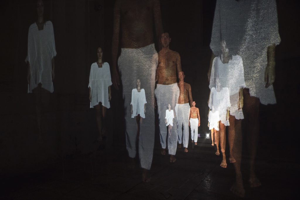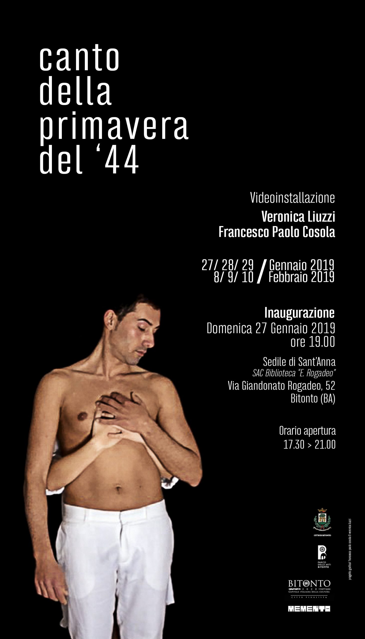 La videoinstallazione, attraverso una serie di schermi olografici disseminati all’interno del Sedile di Sant’Anna, crea uno spazio immersivo nel quale lo spettatore è libero di addentrarsi; l’opera concentra in sé la volontà di far risaltare quel bene che ognuno possiede, invitando il visitatore a instaurare un’interazione empatica con quello che accade all’interno dell’ambiente. Una schiera di “uomini di luce” si materializza sugli schermi sospesi. Le figure comunicano, compiono gesti, avanzano verso l’osservatore. Corpi evanescenti, provengono dal buio, a ricordare quel buio che li ha inghiottiti; si “ripetono” nel tempo e nello spazio (dal lat. repetĕre, ossia “dirigersi di nuovo verso qualcuno”), si stratificano e dirigono verso lo spettatore il cui punto di osservazione genera una sorta di isotopia della visibilità: i corpi appaiono e scompaiono a seconda della posizione dell’osservatore e, a seconda del suo punto di vista, si sovrappongono l’un l’altro. L’immagine insiste, imprime una traccia nella memoria, nella percezione del fruitore. Chi osserva si interfaccia con un ipotetico alter ego immateriale, ascolta il suo lamento silenzioso, inudibile ma percepibile. All’immagine dell’uomo si alternano parole tratte da alcuni testi cantati nei campi di concentramento. Il titolo dell’opera “Canto della Primavera del ‘44”, trae ispirazione dal “Canto di Hammerstein” conosciuto anche come “Inno dei prigionieri italiani di Hammerstein”, il cui autore si identifica nella figura del tenente Lorenzo Lugli. Per i musicisti dell’epoca, comporre musica e parole, ha rappresentato l’unica possibilità di conservazione e rinnovamento di quella libertà tipica di una coscienza che chiede, sotto pressione, una “resistenza spirituale”. In questo caso, il “tango”, ritmo che accompagna le parole di questo celebre canto, è espressione di quelle sfumature sonore che salvano l’uomo dall’incapacità comunicativa; il tango infatti è sinonimo di gioia, dolore, nostalgia, festa, è la melodia che riscalda l’animo dalle tenebre che calano all’orizzonte. Il tango porta alla luce quadri di persone che si stringono in abbracci senza tempo, per conservare in sé il disegno di un futuro migliore.