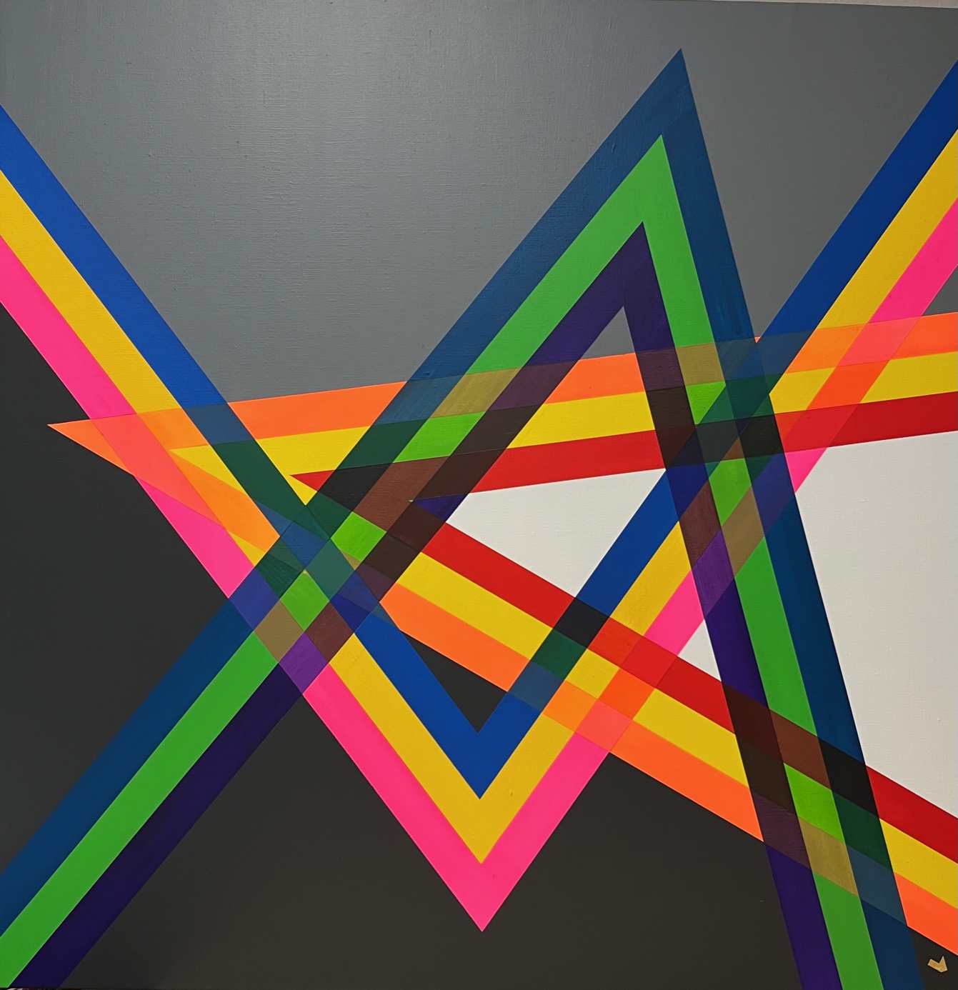 La narrazione del ciclo delle “Trasparenze” si muove tutta su linee rette e figure geometriche triangolari nette e definite, che per l’artista e l’osservatore possono essere replicabili all’infinito, quindi oltre la stessa superfice della tela.