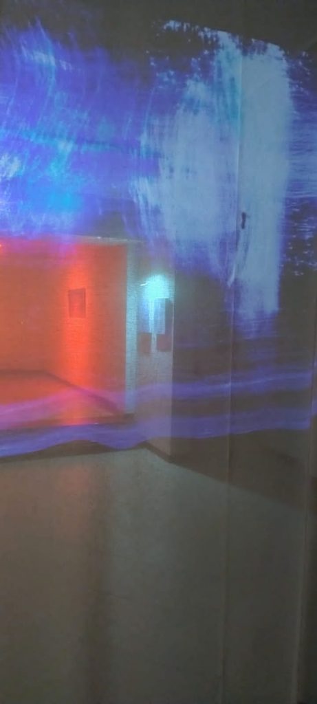 vortice di luci e gesti pittorici, Cassandra sprofonda in un corridoio rosso, supera