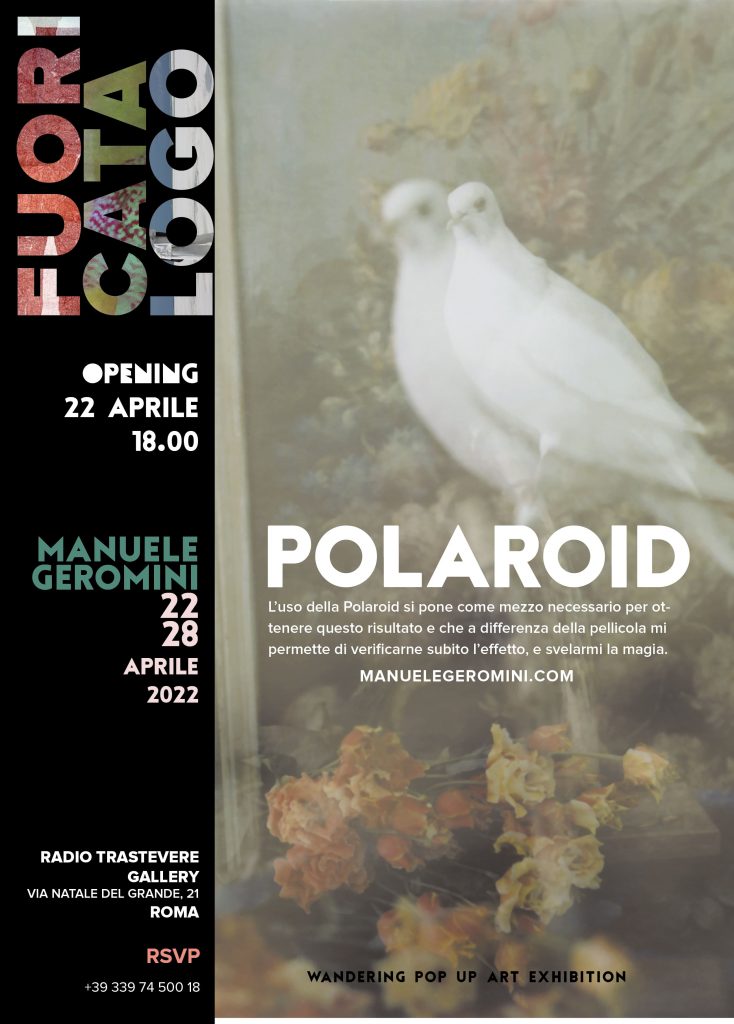 Dal 22 al 28 aprile 2022, Radio Trastevere Gallery ospiterà Polaroid di Manuele Geromini, la seconda mostra pop up di “Fuori catalogo. Wandering Pop Up Art Exhibition”, un progetto curato da Barbara Braghittoni che pone al centro dell’attenzione il ritorno ai valori del dialogo e del confronto tra esseri umani, elementi che da sempre nutrono anima e corpo. Durante l’opening del 22 aprile alle ore 18.00 sarà inoltre presentato un reading accompagnato da un’improvvisazione totale con sintetizzatori del dj HUMANBEING.